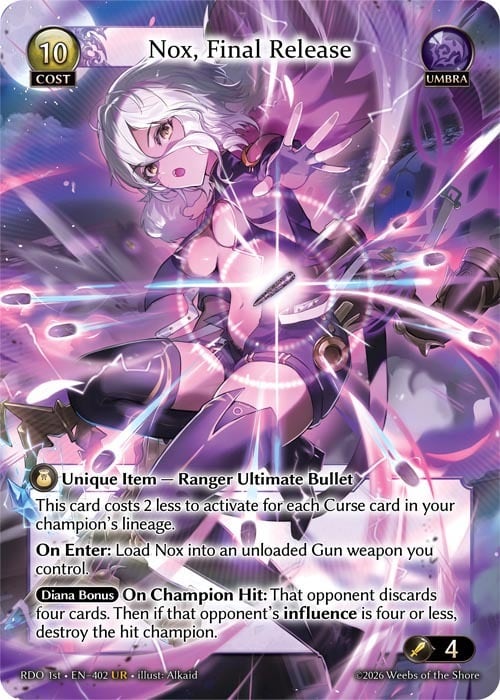 Diana Bonus On Champion Hit: That opponent discards four cards. Then if that opponent’s influence is four or less, destroy the hit champion.