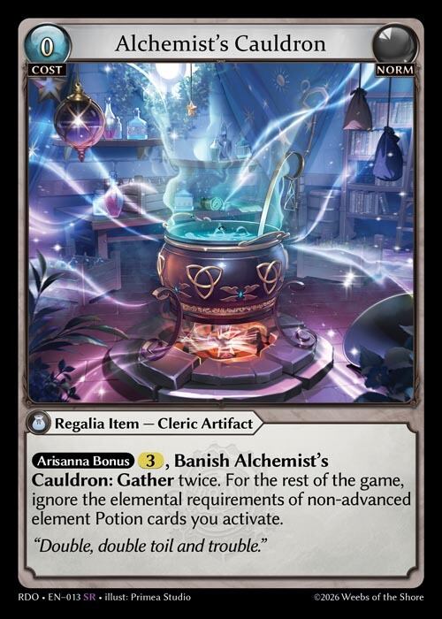 Arisanna Bonus 3, Banish Alchemist’s Cauldron: Gather twice. For the rest of the game, ignore the elemental requirements of non-advanced element Potion cards you activate.