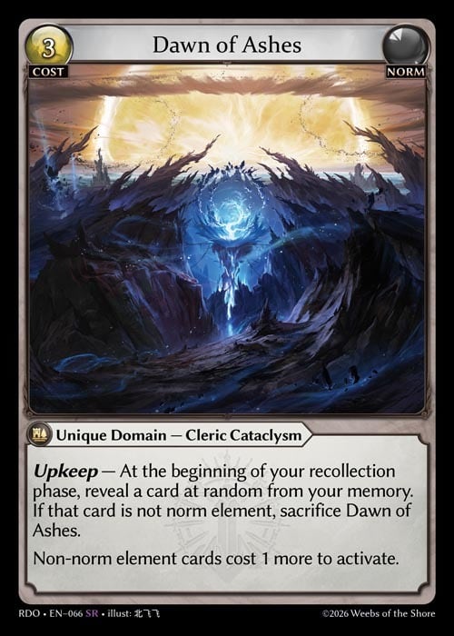 Upkeep — At the beginning of your recollection phase, reveal a card at random from your memory. If that card is not norm element, sacrifice Dawn of Ashes.